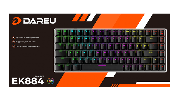 Với màu đen tối giản, bàn phím EK884 hướng đến phong cách thiết kế đơn giản, tinh gọn. Layout bao gồm 84 phím nhỏ gọn, dành cho những ai yêu thích sự tiện lợi bởi bàn phím dễ dàng mang xách, cất gọn trong balo. Điều này cũng thích hợp cho dân văn phòng hay di chuyển. Bàn phím cơ Dare-U EK884 còn được trang bị hệ thống đèn led RGB sống động, với độ nháy đèn thay đổi lên đến 16,8 triệu màu sắc. Tính năng tuyệt vời này mang đến cho game thủ những màn chơi game kết hợp ánh sáng ấn tượng, tạo nên phong cách cá tính độc đáo cho bàn phím.