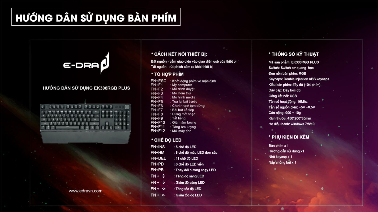 Bàn phím cơ giá rẻ E-Dra EK308 RGB Optical là một trong những bàn phím có khả năng chống nước rất tốt. Bên cạnh đó, được trang bị Led RGB 16.8 triệu màu trên phím và viền.