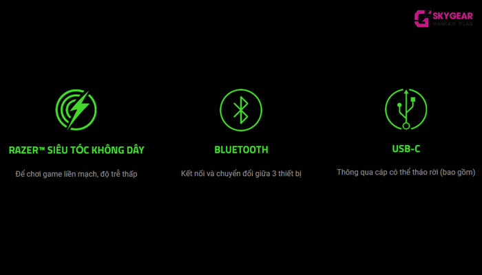 | Kết nối | Razer™ HyperSpeed Wireless (2.4 Ghz), Bluetooth, hoặc USB-C |