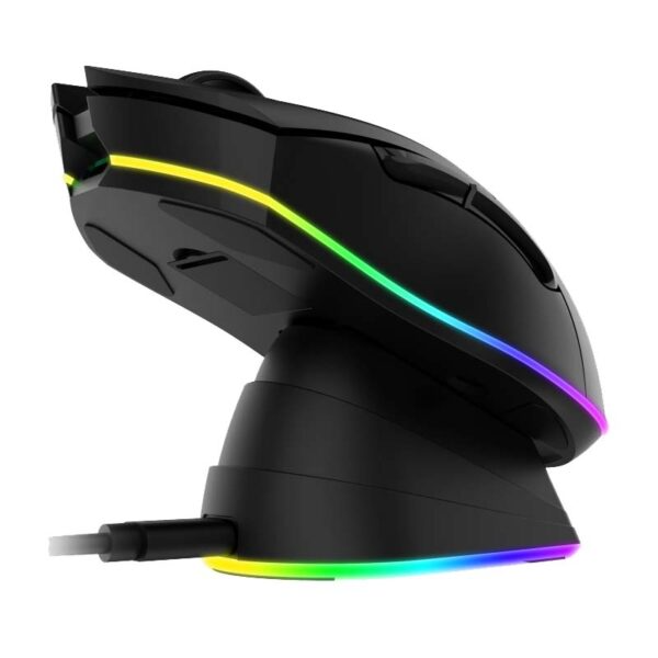 Đi kèm theo chuột có thêm 1 cáp Type-C rời, 1 đầu receiver 2.4g và đặc biệt là chiếc Dock sạc nhanh thiết kế bắt mắt cũng có dải led RGB bo sát viền dưới, tạo sự đồng bộ với chiếc chuột, cả trên chuột và dock sạc đều có nút bật/ tắt để chuyển đổi đèn led RGB.