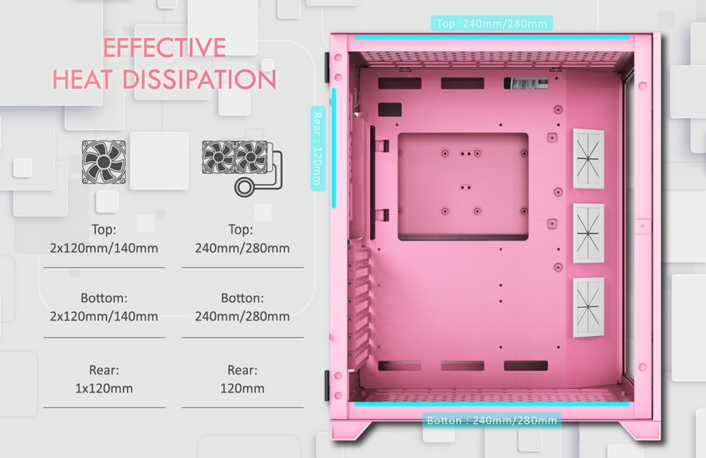 | Hệ thống làm mát ( Quạt ) | Sau: 1 x 120mm ( Chưa kèm theo ) Trên: 2x120mm ( chưa kèm theo) Dưới : 2x120mm ( Chưa kèm theo ) |