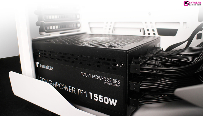 Nguồn máy tính Thermaltake Toughpower TF1 1550W được trang bị nút quạt tăng áp có thể cung cấp luồng gió tăng theo yêu cầu khi cần hiệu suất tối đa. Sản phẩm đảm bảo rằng kết quả thử nghiệm dưới 50ampe. Để tránh làm hỏng các thành phần PSU do công suất đầu ra lớn. Sản phẩm cung cấp một jumper cho PSU của người dùng để cung cấp điện cho card đồ họa mà không cần kết nối với bo mạch chủ. Để kiểm tra quạt để xem chúng có quay khi nguồn điện được bật hay không.